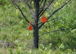 A suitable backstop is again your first consideration, and then a few tree branches (or simple target stands) on which to attach the targets, which measure from 2 inches in diameter to 8 inches. They're available in orange, red, yellow and black.